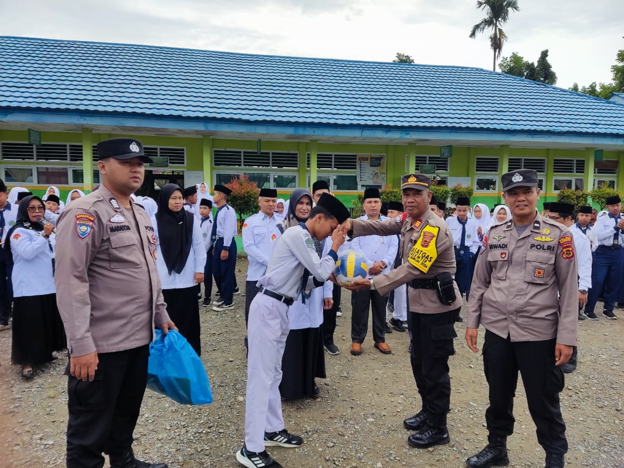 Setelah upacara selesai, AKP Edin, SH menyerahkan cenderamata berupa bola voli kepada pihak sekolah. “Semangat dalam berolahraga adalah bagian dari membentuk mental dan fisik yang sehat. Saya harap bola voli ini bisa bermanfaat untuk kegiatan olahraga di madrasah ini,†ujarnya.
