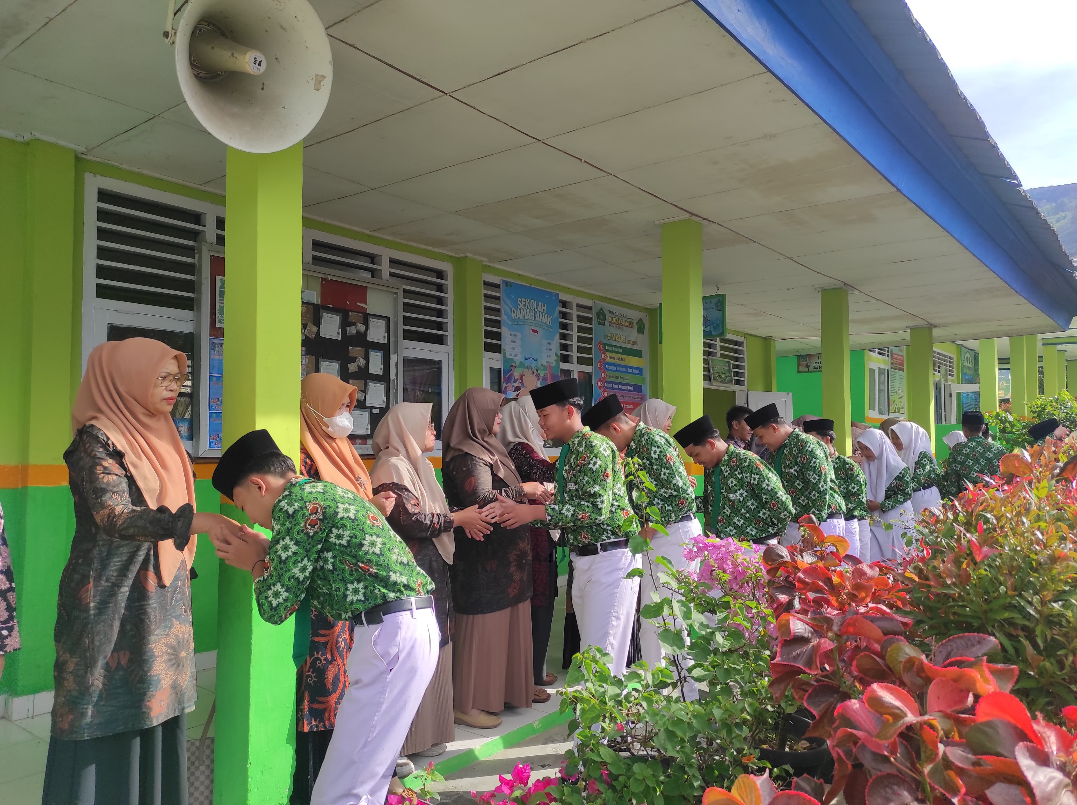 Usai pelaksanaan apel, kegiatan dilanjutkan dengan acara halal bihalal antara siswa dengan tenaga pendidik dan kependidikan. Suasana haru dan hangat terasa ketika para siswa bersalaman dan saling memaafkan dengan para guru dan staf madrasah, mencerminkan nilai-nilai luhur yang diajarkan selama bulan suci Ramadan.