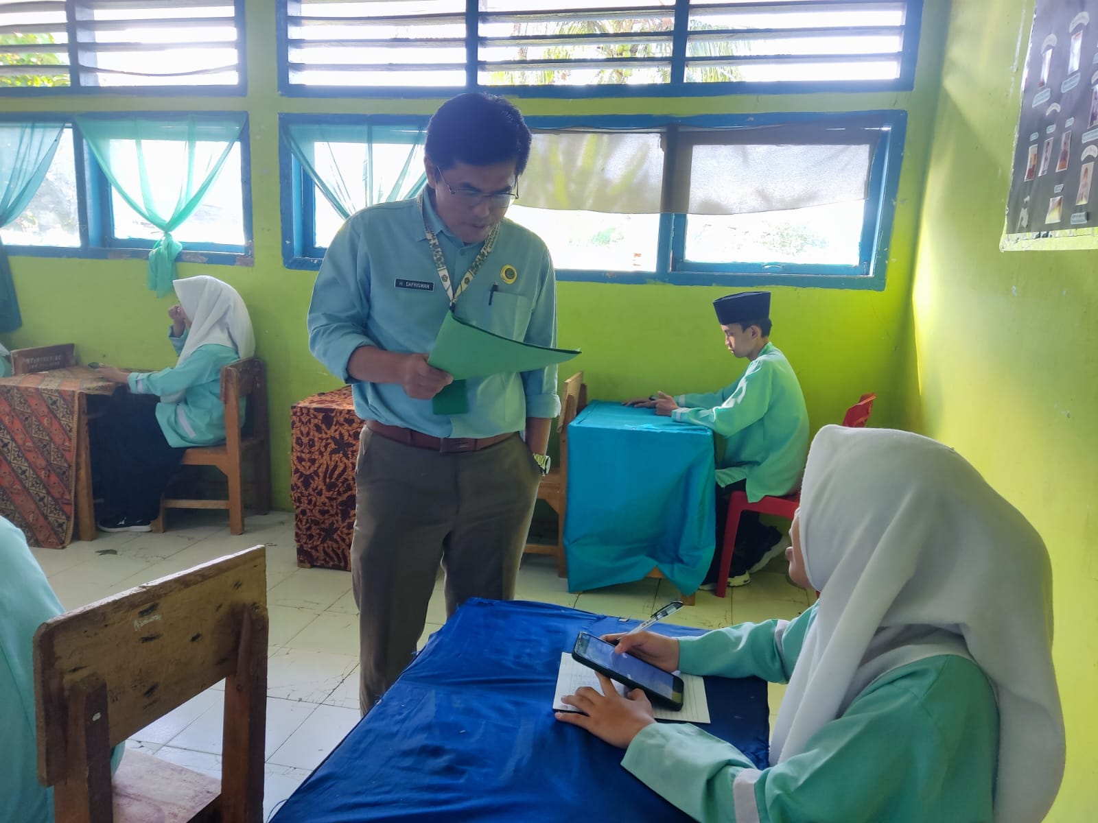 Kerinci, Jumat 25 April 2025 – Tim Monitoring Kegiatan Ujian Madrasah (UM) dari Kantor Kementerian Agama Kabupaten Kerinci hari ini berkunjung ke MTsN 1 Kerinci untuk memastikan jalannya ujian berlangsung lancar dan sesuai prosedur. Rombongan yang dipimpin Kaur Tata Usaha Kemenag Kabupaten Kerinci, Bapak Afandi, S.PdI., M.Pd., serta Kasi Madrasah, Bapak Dafrisman, S.Pd., M.PdI., disambut hangat oleh Kepala MTsN 1 Kerinci, Ibu Hasminiyeti, S.Ag., M.Pd.