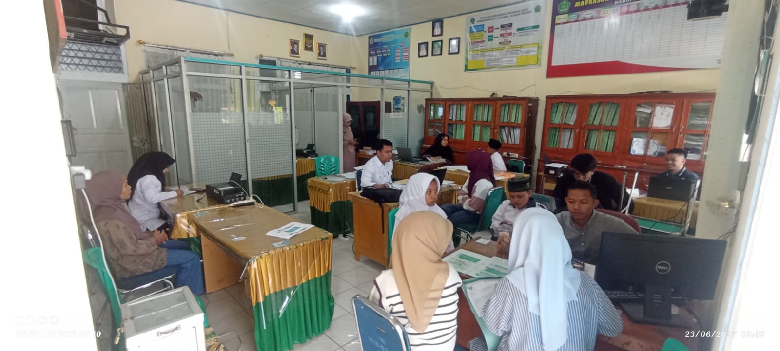 Di tengah suasana madrasah yang relatif sepi dari aktivitas siswa, ruang tata usaha tetap aktif melayani keperluan administrasi, termasuk pelayanan bagi orang tua/wali murid, pengurusan dokumen, hingga mendukung proses Penerimaan Peserta Didik Baru (PPDB) yang masih berjalan.