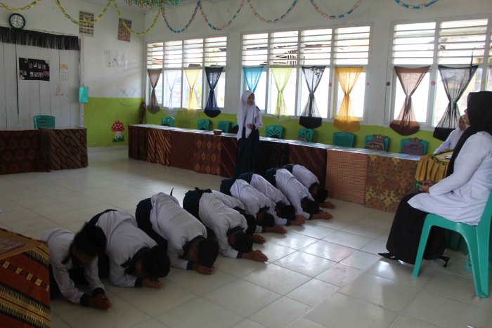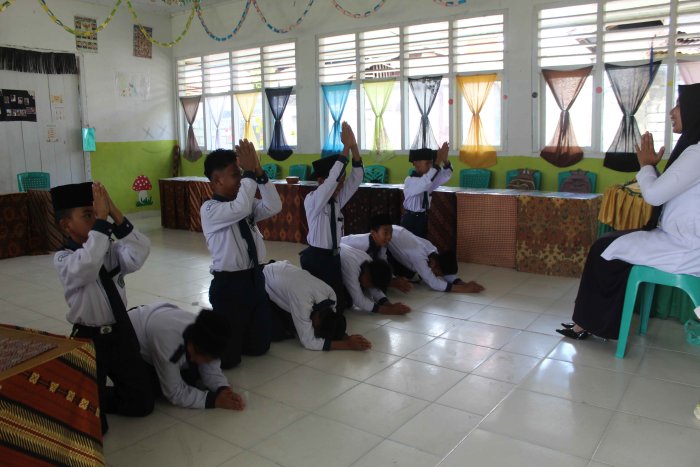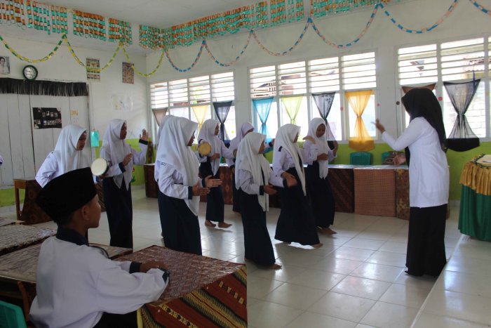 Suasana kelas terlihat meriah dan hidup. Para siswi dengan antusias mempraktikkan gerakan tari Rangguk yang lemah gemulai, sedangkan para siswa bersemangat mengikuti pola gerakan dinamis dari tari Saman yang membutuhkan kekompakan dan ketelitian.