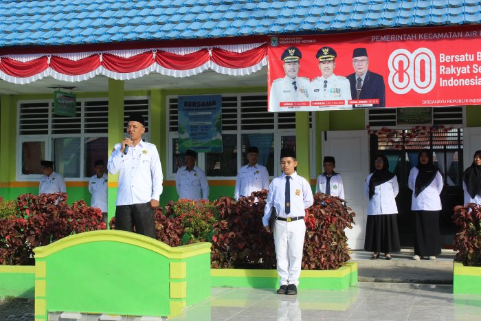 Kemantan, MTsN 1 Kerinci kembali melaksanakan upacara bendera rutin di lapangan madrasah. Upacara yang dimulai pukul 07.15 WIB ini berlangsung khidmat dengan barisan rapi dari seluruh peserta didik. Petugas upacara kali ini adalah siswa kelas VIII A yang tampil percaya diri di bawah bimbingan wali kelas, Ibu Leli Herianti, M.Pd.