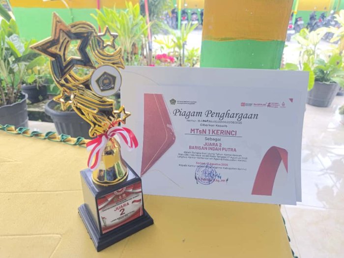 Kerinci � Satu lagi prestasi membanggakan ditorehkan oleh siswa MTsN 1 Kerinci. Pada ajang Lomba Barisan Indah tingkat MTs se-Kabupaten Kerinci yang digelar oleh Kementerian Agama Kabupaten Kerinci dalam rangka memperingati HUT ke-80 Republik Indonesia, Tim Putra MTsN 1 Kerinci berhasil meraih Juara II.