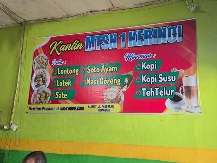 Kantin halal MTsN 1 Kerinci menyediakan berbagai pilihan makanan ringan hingga menu bergizi dengan harga yang terjangkau bagi siswa. Selain rasanya yang enak, siswa juga merasa lebih aman karena seluruh produk yang dijual sudah melalui pengawasan madrasah terkait kebersihan dan kehalalannya.