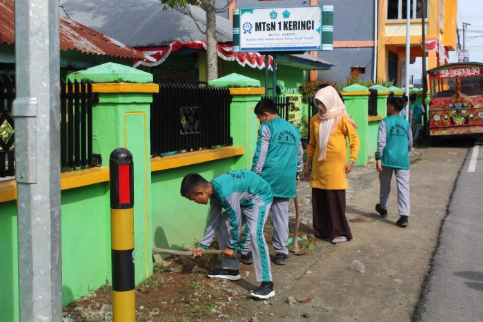 Kerinci, MTsN 1 Kerinci hari ini melaksanakan kegiatan gotong royong serentak dalam rangka menindaklanjuti surat edaran dari Kantor Kementerian Agama Kabupaten Kerinci tentang Gerakan Kementerian Agama Aman, Sejuk, Rindang, dan Indah (Kemenag ASRI).
