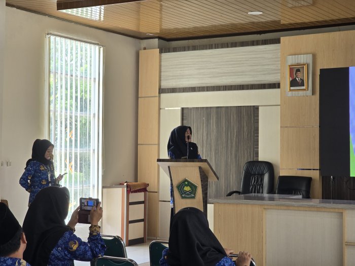 Kerinci , Kepala Madrasah Tsanawiyah Negeri (MTsN) 1 Kerinci menyampaikan pemaparan Laporan Capaian Kinerja Triwulan III Tahun 2025 di Aula Pelayanan Haji dan Umroh Terpadu (PLHUT) Kantor Kementerian Agama Kabupaten Kerinci, Rabu (1/10/2025). Laporan tersebut memuat realisasi program dan indikator kinerja madrasah pada periode Juli hingga September 2025.
