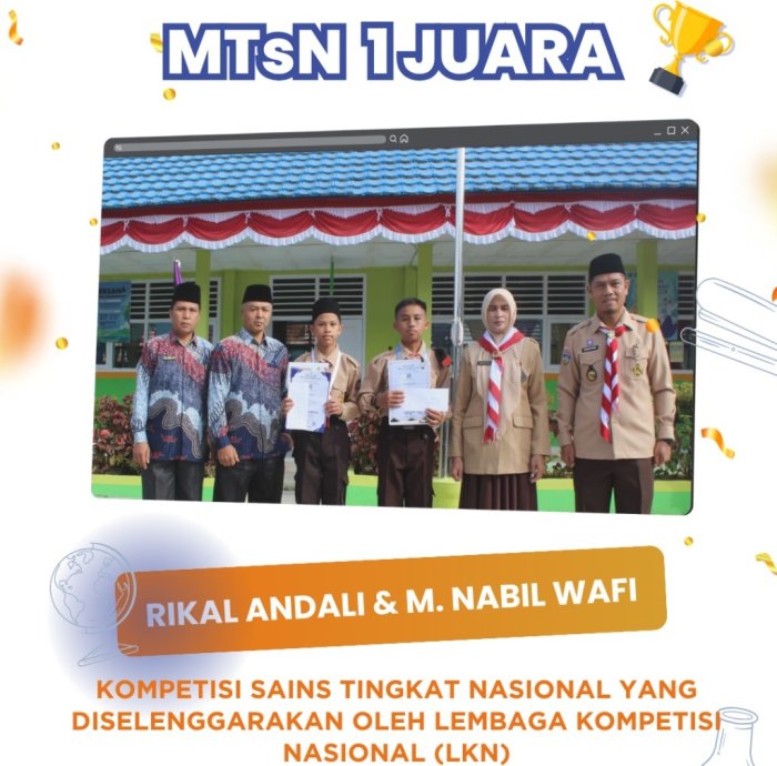 Kemantan , MTsN 1 Kerinci – Semester ganjil tahun 2025 menjadi masa penuh kebanggaan bagi keluarga besar MTsN 1 Kerinci. Sejumlah siswa berhasil menorehkan prestasi gemilang di berbagai ajang, baik tingkat kabupaten maupun nasional. Capaian ini menjadi bukti nyata komitmen madrasah dalam mewujudkan generasi unggul, disiplin, dan berakhlakul karimah.
