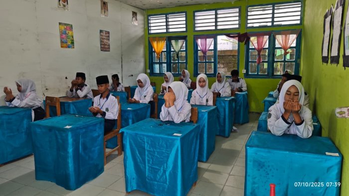 Kemantan , suasana pagi di MTsN 1 Kerinci terasa begitu khusyuk dan penuh kekhidmatan. Sebelum dimulainya Ujian Sumatif Tengah Semester (STS) Ganjil Tahun Ajaran 2025/2026, para siswa tampak menundukkan kepala, menengadahkan tangan, dan memanjatkan doa bersama di ruang ujian masing-masing.