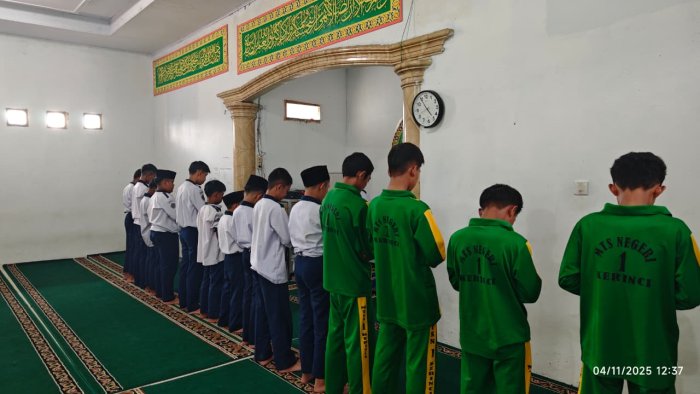 Kerinci, Selasa (5/11/2025), suasana Mushalla Baitul Ilmi MTsN 1 Kerinci tampak khusyuk saat para siswa dari kelas 9A dan 7D melaksanakan kegiatan shalat berjamaah bersama guru pembimbing. Kegiatan rutin ini menjadi salah satu bentuk pembinaan karakter religius yang terus digiatkan di lingkungan madrasah.