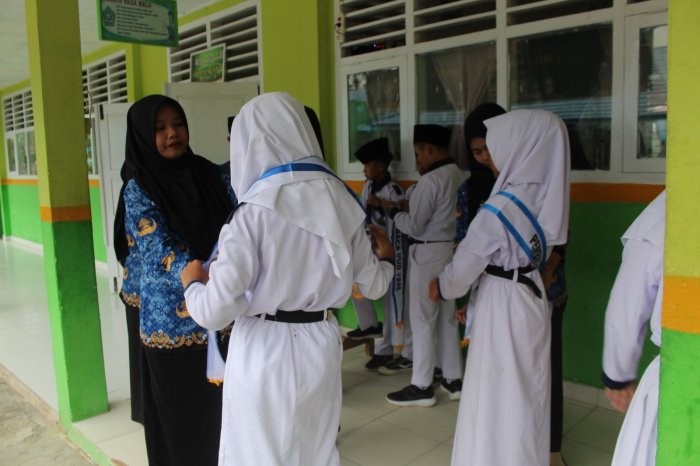 Para petugas upacara Dari Kelas VII D tampak memantapkan posisi barisan dan memeriksa kelengkapan atribut upacara. Sementara itu, guru pendamping dan mahasiswa PLP turut membantu memastikan semua perlengkapan seperti tiang bendera, sound system, teks naskah upacara, dan dekorasi sudah siap digunakan.