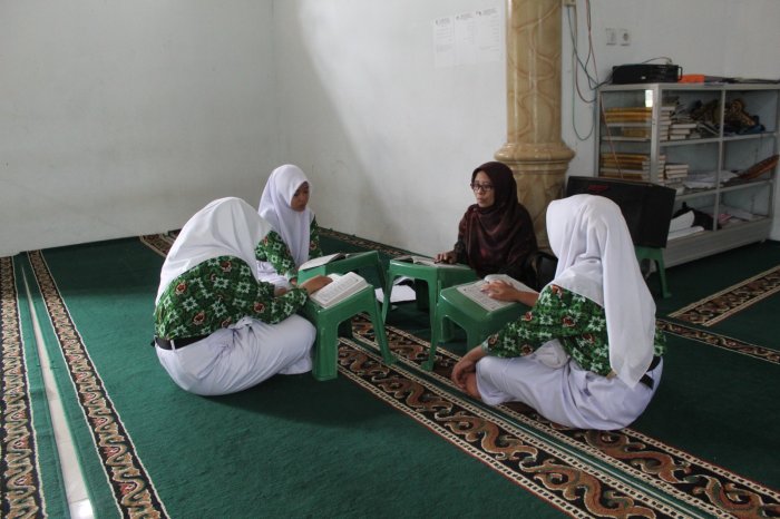 Dalam suasana mushalla yang tenang, para siswa duduk membentuk kelompok kecil sambil membuka mushaf masing-masing. Ibu Harnilis memberikan arahan tentang cara membaca huruf-huruf hijaiyah dengan makhraj yang tepat, memperbaiki kesalahan bacaan, serta menekankan pentingnya tajwid agar lantunan ayat semakin indah dan sesuai kaidah.