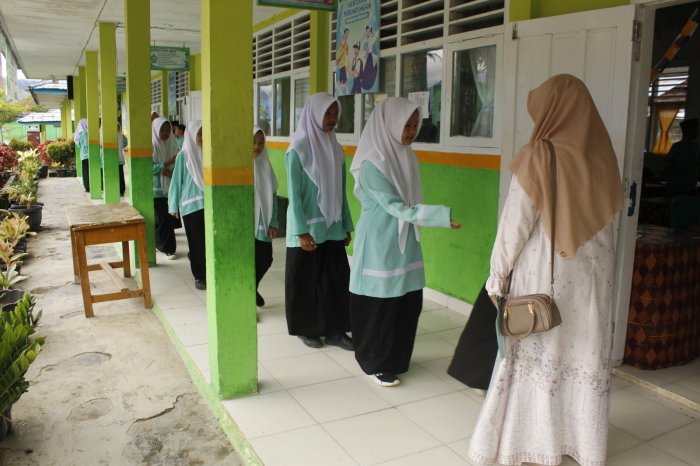 Kegiatan ini dilaksanakan secara rutin, di mana para siswa memberikan salam kepada guru atau wali kelas yang sudah menunggu di depan ruang belajar. Dengan penuh sopan santun, siswa menyapa sambil menundukkan kepala dan mengucapkan salam sebelum melangkah masuk. Suasana hangat dan penuh rasa hormat tercipta di setiap pintu kelas.
