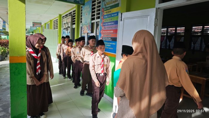 Tampak para siswa berseragam pramuka mengulurkan tangan untuk bersalaman dengan guru sebelum memasuki ruang ujian. Suasana hangat dan penuh kesantunan ini menjadi bukti upaya madrasah dalam membentuk karakter mulia sejak dini.