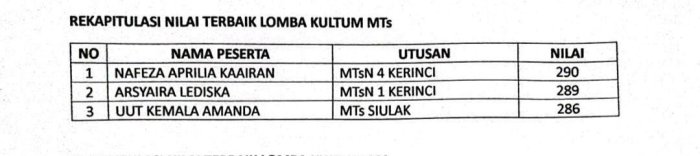 Berdasarkan hasil penilaian dewan juri, Arsyaira Lediska memperoleh nilai 289, bersaing dengan puluhan peserta dari berbagai madrasah tsanawiyah se-Kabupaten Kerinci. Kegiatan ini menjadi wadah penguatan karakter religius sekaligus ajang unjuk kemampuan dakwah generasi muda madrasah.