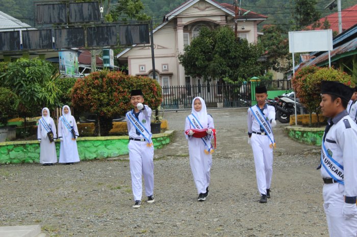 Petugas pengibar bendera yang terdiri dari peserta didik terpilih melaksanakan tugasnya dengan penuh tanggung jawab. Prosesi pengibaran bendera berlangsung tertib dan lancar, diiringi lagu kebangsaan Indonesia Raya yang dinyanyikan bersama oleh seluruh peserta upacara dengan sikap sempurna.