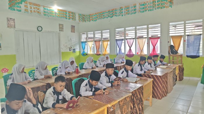 Tadarus pagi hari ini dipimpin oleh Arsyaira Lediska dan Arofah Nolis, yang dengan penuh khidmat memandu pembacaan ayat suci Al-Qur’an. Suasana kelas terlihat tenang dan tertib, para siswa mengikuti bacaan dengan penuh kesungguhan, sementara guru membimbing serta memastikan pelaksanaan berjalan lancar.