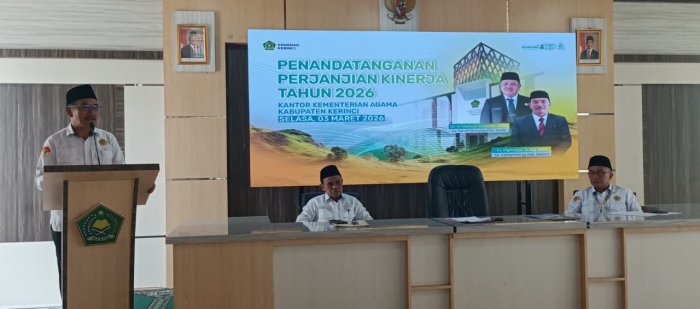 Kerinci – Kepala MTsN 1 Kerinci mengikuti kegiatan Penandatanganan Perjanjian Kinerja (PK) Tahun 2026 yang dilaksanakan di Kantor Kementerian Agama Kabupaten Kerinci. Kegiatan ini merupakan bagian dari komitmen peningkatan kinerja dan akuntabilitas satuan kerja di lingkungan Kementerian Agama.