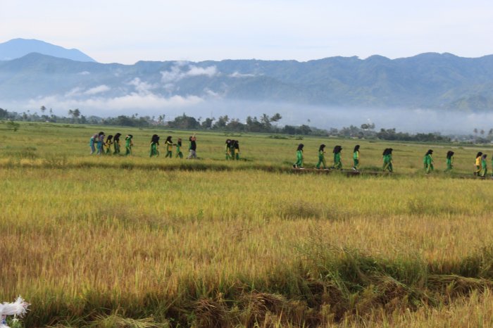 Rute jalan santai yang dipilih menyuguhkan pemandangan alam yang indah, di mana hamparan persawahan tampak mulai menguning keemasan, menandakan musim panen yang semakin dekat. Udara segar khas pedesaan menambah kenyamanan selama kegiatan berlangsung, membuat seluruh peserta tampak menikmati setiap langkah perjalanan.
